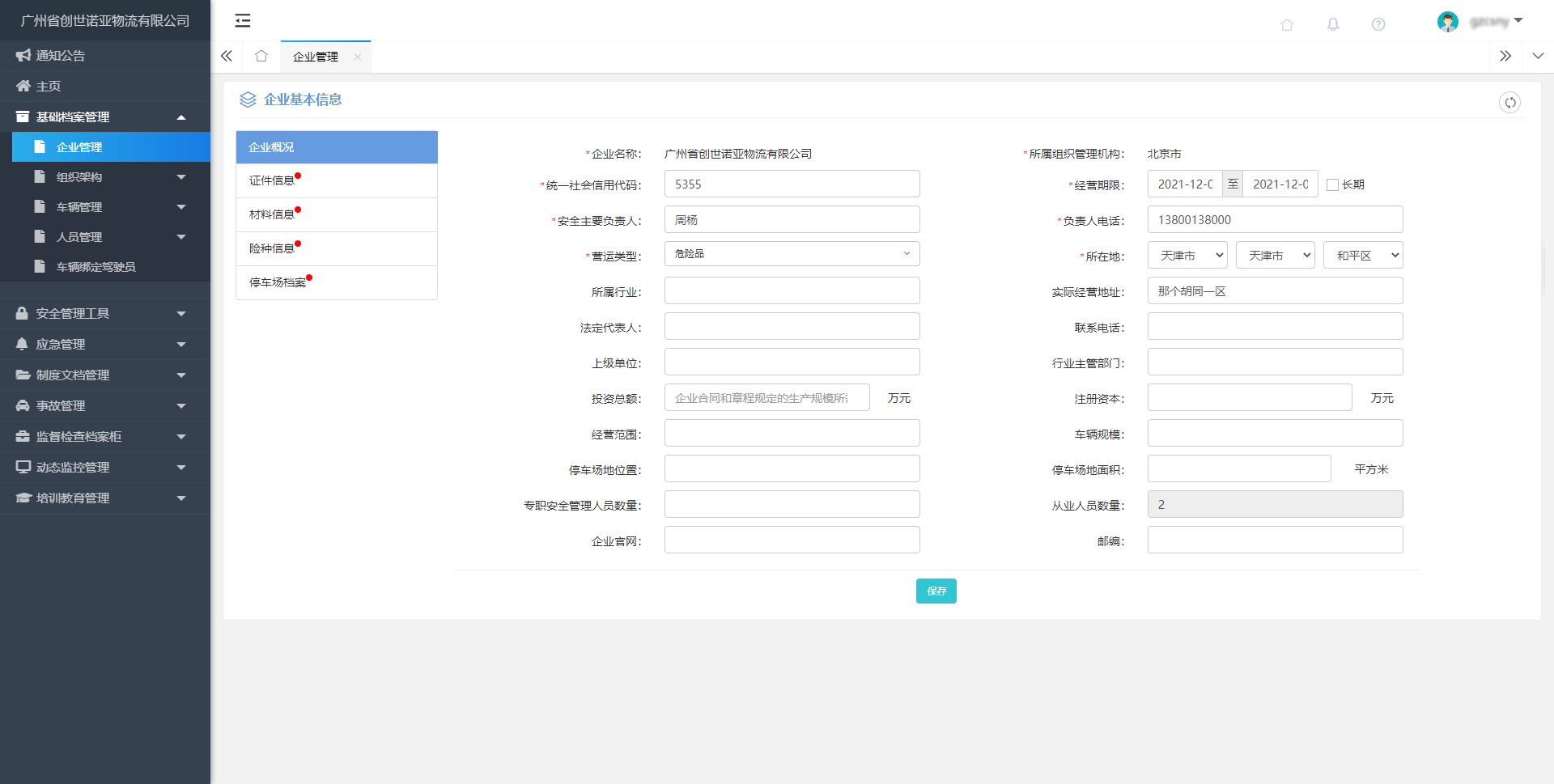 基础档案是对运输企业基础资料的管理,包括基本的人、车、企业和线路等基础资料生命周期管理,把我们熟知的一车一档,一人一档和一企一档进行规范化高效的管理。