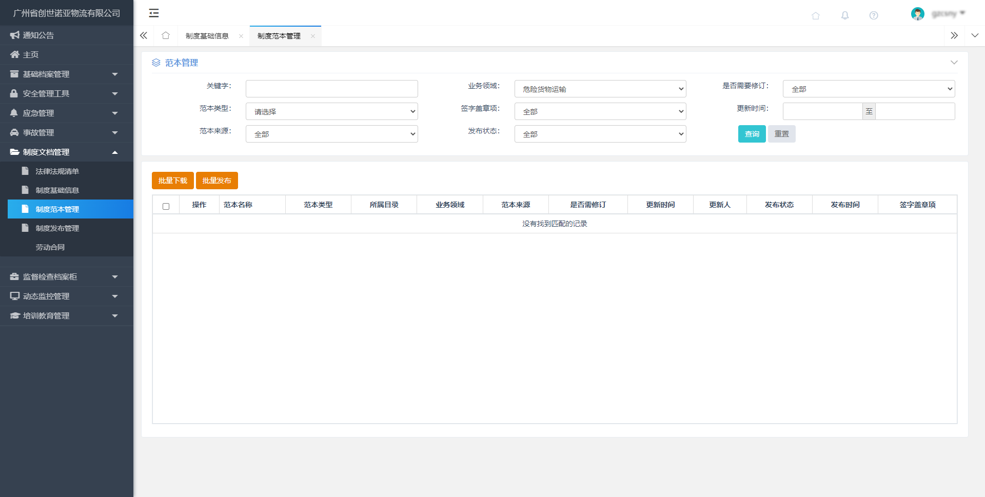 制度文档通过对组织结构的设置,根据人员的变动和法律法规的修订智能的动态运行,生成符合监管要求的制度文件并提醒相关人员签字盖章。该模块是运输企业合规化经营的基础。